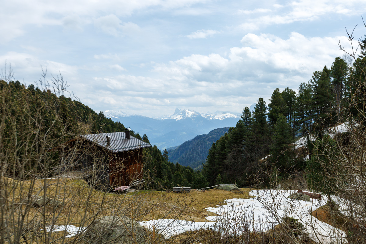 Du wanderst nun links weiter. Der flache Schotterweg führt dich weiter durch den Wald bis Du erneut an eine Abzweigung kommst. Dort stand bei uns ein handgeschriebenes schwarzes Schild „Rinderplatz“ Fahrweg und wieder das weiße Rinderplatz Hütte Schild an dem du geradeaus vorbei wanderst. An dieser Abzweigung hast Du ein weiteres klasse Panorama auf die Dolomiten. Du kommst nun als nächstes zur Mair in Plun Hütte, der Weg hoch zur Hütte bietet ein Postkarten-Motiv.